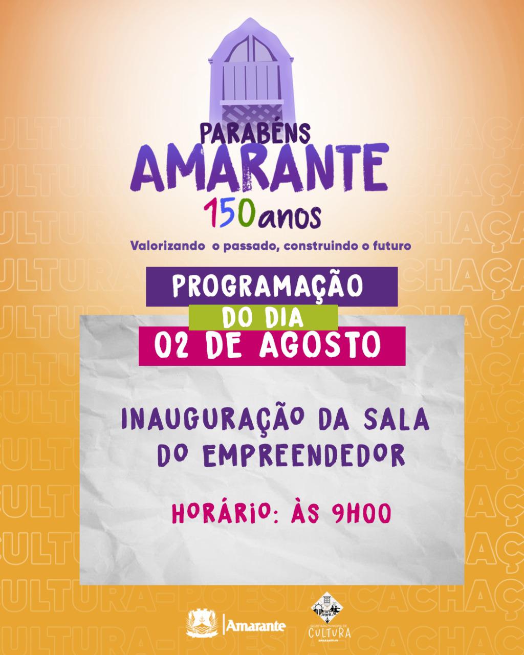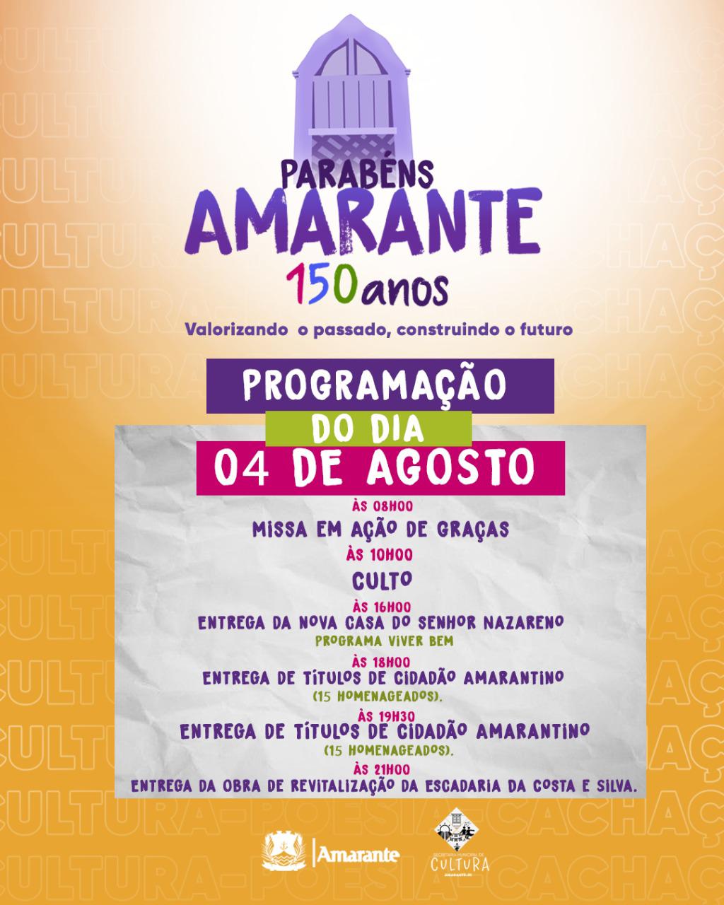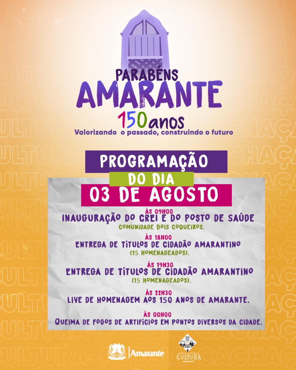 Ainda na noite do dia 03 de agosto, a programação continua com uma live de homenagem à cidade, que vai marcar a chegada dos 150 anos de emancipação política de Amarante. À meia-noite haverá queima de fogos de artifícios em diversos pontos distintos.