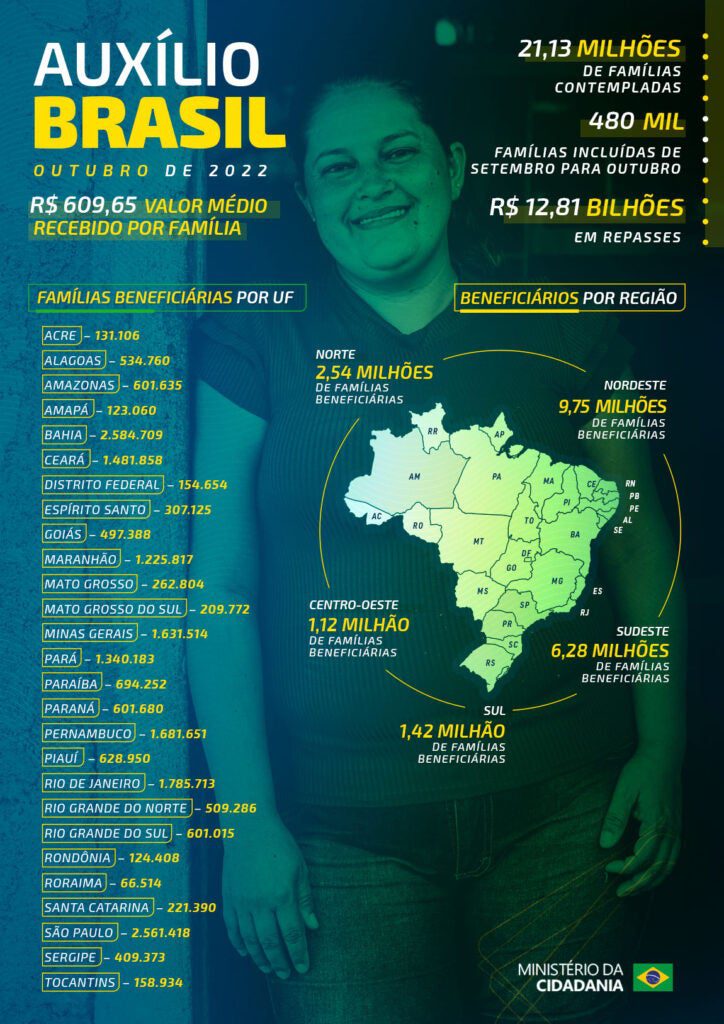 Nessa terça-feira (11), mais de 21,13 milhões de famílias começaram a receber o Auxílio Brasil no valor mínimo de R$ 600 reais. Os recursos, fruto do investimento de mais de R$ 12,81 bilhões, serão repassados às famílias de todos os 5.570 municípios brasileiros.