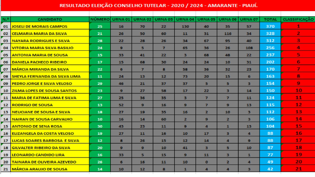 As eleições para escolha dos novos membros do Conselho Tutelar de Amarante foram finalizadas depois das 17h deste domingo (6). A relação nominal somente foi divulgada por volta das 22h.