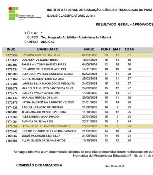 APROVAÇÃO NO IFPI – O Instituto Federal de Educação, Ciência e Tecnologia do Piauí (IFPI) divulgou nesta quinta-feira (25) o resultado geral dos aprovados, que trouxe a estudante do Colégio Pitágoras II, Raynny Martins da Silva, 14 anos, como a primeira colocada no curso de Administração do Campus de Angical-PI.