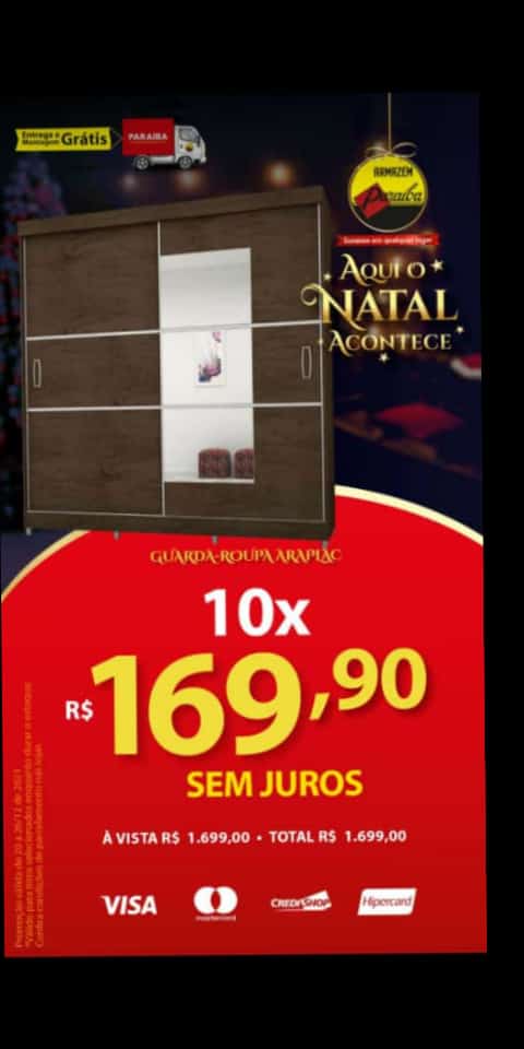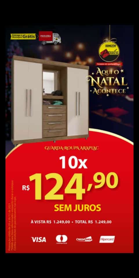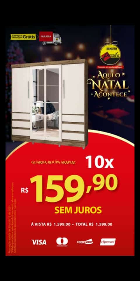 Os melhores preços e as melhores ofertas de Natal, você tem aqui! Temos guarda-roupas 04 portas e 04 gavetas em até 10x sem juros; guarda-roupas 03 portas e 06 gavetas em até 10x sem juros.