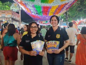 Na ocasião, uma equipe da DPCA distribui panfletos informativos com a finalidade de divulgar a campanha “ Faça Bonito Nesse São João” , que visa o combate a qualquer tipo de violência contra a criança e ao adolescente.