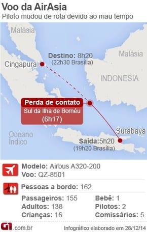 “AirAisa Indonésia lamenta confirmar que a torre de controle de tráfego aéreo perdeu contato com o voo QZ-8501 [Surabaya a Cingapura] às 7h24 desta manhã”, disse a companhia em um comunicado. “Operações de busca e resgate estão em andamento. AirAsia está cooperando plenamente com a assistência e serviços de salvamento”, diz a nota.