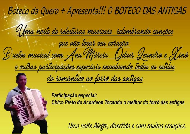 A noite do Boteco das Antigas vai contar também com a participação especial de Chico Preto do Acordeon, que vai tocar o melhor do forró do passado.