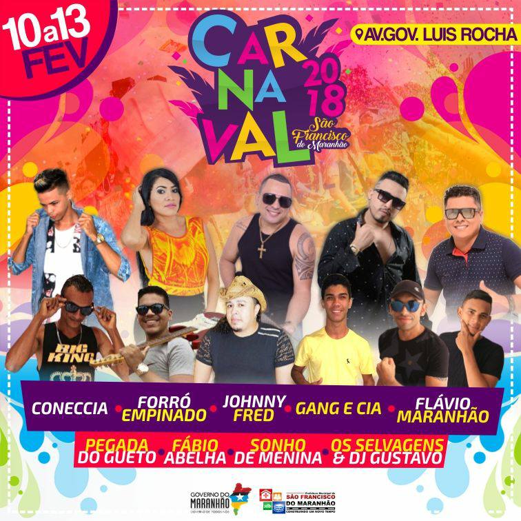 CARNAVAL DE SÃO FRANCISCO DO MA – Grandes atrações vão animar o Carnaval 2018, em São Francisco do Maranhão, a partir do dia 10 com vasta programação aos foliões, a iniciar com um encontro de paredões, a partir das 17h. O evento é uma realização da Prefeitura de São Francisco do Maranhão, com apoio do Governo do Maranhão.