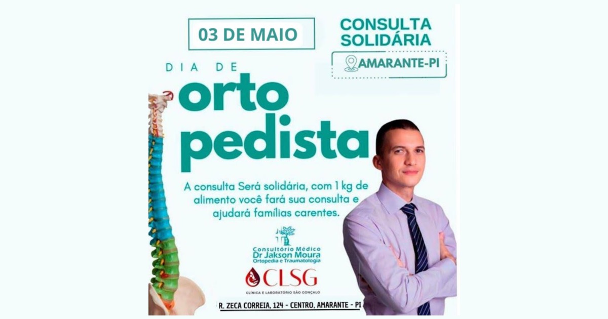 No dia 3 de maio, sábado, o Dr. Jakson Moura, ortopedista e traumatologista, vai realizar atendimento com consultas solidárias em Amarante. A ação visa facilitar o acesso aos cuidados com a saúde ortopédica e, ao mesmo tempo, ajudar famílias carentes da região.