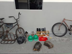 De posse da informação, policiais civis, com apoio de guardas municipais estiveram no endereço apontado, onde localizaram a bicicleta furtada, uma arma de fogo, quatro munições intactas, apetrechos para o tráfico de drogas, dinheiro trocado, aparelhos celulares de origem duvidosa e dois animais silvestres, sem autorização do órgão competente. O imóvel seria de propriedade do segundo investigado, de 19 anos.