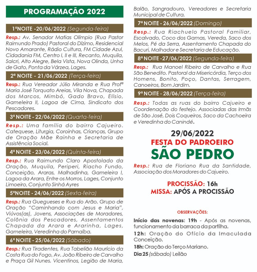 Os festejos de São Pedro, padroeiro do bairro Cajueiro – em Amarante, terão início no próximo dia 20, segunda-feira. A programação, que será finalizada no dia 29 de junho, terá a participação de vários bairros e comunidades do município.