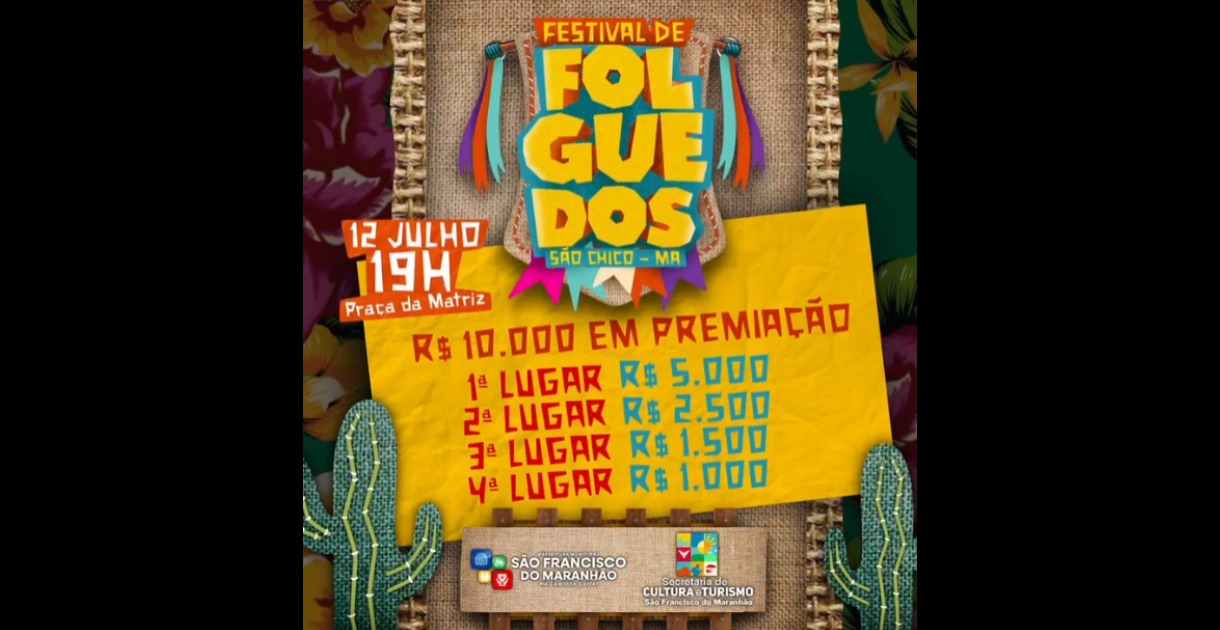 A competição do Festival de Folguedos de São Francisco do Maranhão vai distribuir um total de R$ 10.000 em premiações, sendo R$ 5.000 para o primeiro lugar, R$ 2.500 para o segundo, R$ 1.500 para o terceiro e R$ 1.000 para o quarto colocado.