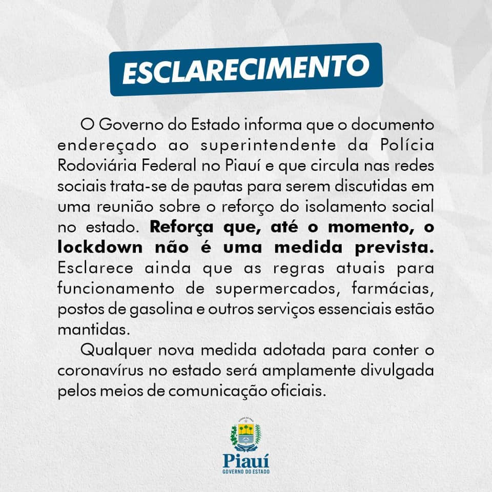 “Governo do Estado informa que o documento endereçado ao superintendente da Polícia Rodoviária Federal do Piauí e que circula nas redes sociais trata-se de pautas para serem discutidas em uma reunião sobre o reforço do isolamento social no estado. Reforça ainda que até o momento o lockdown não é uma medida para Vista. esclarece ainda que as regras atuais para funcionamento de supermercados, farmácia, postos de gasolina e outros serviços essenciais estão mantidos. Qualquer nova medida adotada para conter o coronavirus no estado será amplamente divulgada pelos meios de comunicação oficiais.”