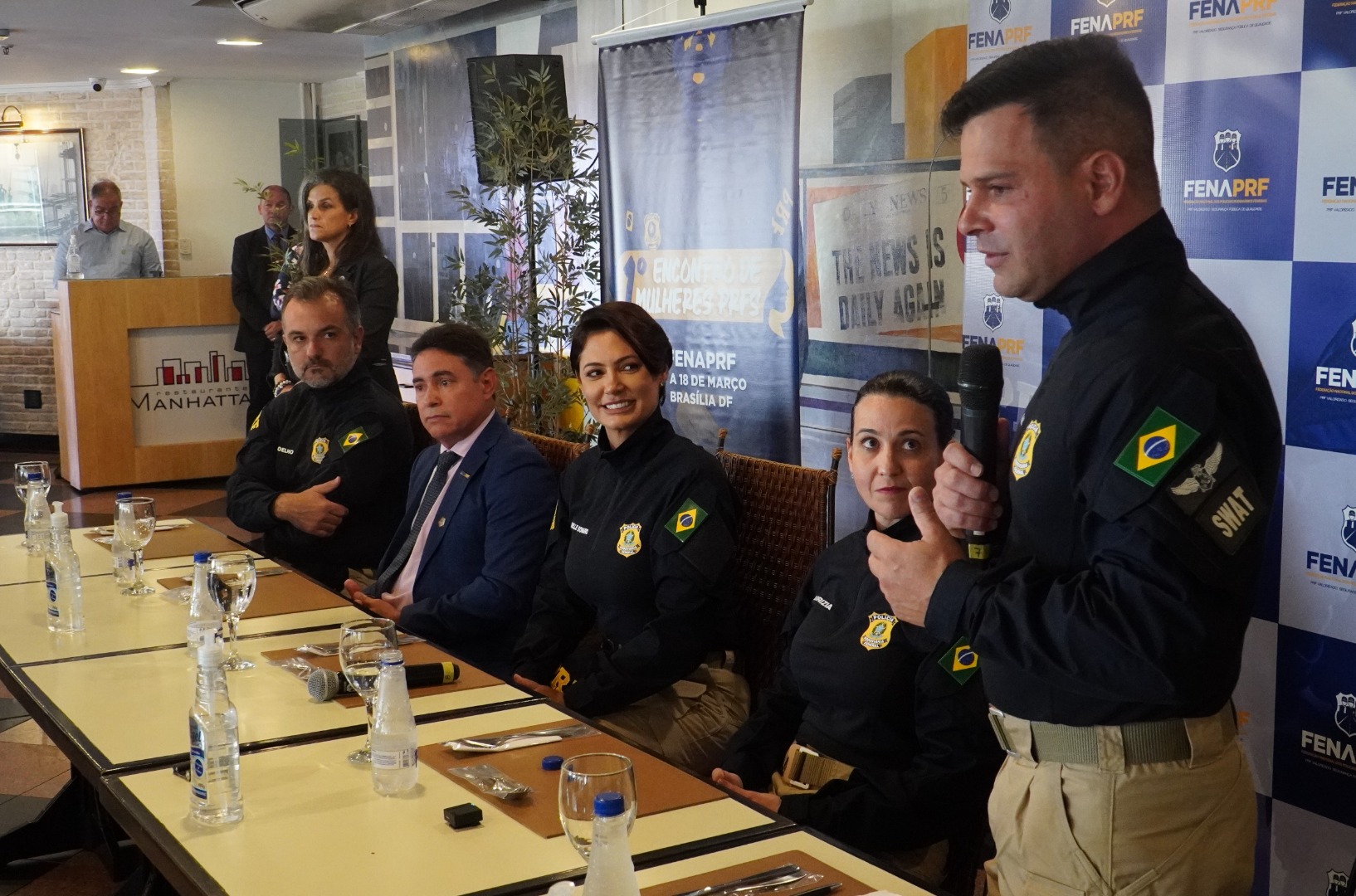 A primeira-dama do Brasil, Michele Bolsonaro, homenageou a Polícia Rodoviária Federal (PRF). Vestida com o uniforme operacional da instituição, participou do Encontro de Mulheres PRFs realizado pela Federação dos Policiais Rodoviários Federais, em Brasília.