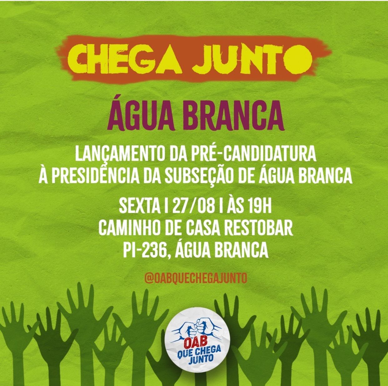 O movimento ‘OAB que Chega Junto’ irá participar do evento de lançamento da pré-candidatura à presidência da subseção do município de Água Branca, que acontecerá nesta sexta-feira (27), no Caminho de Casa Restobar, a partir das 19h.