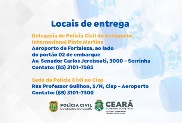 A contribuição da água arrecadada no primeiro dia da ação conta com a solidariedade e o apoio da população cearense, de policiais civis, colaboradores da PCCE e empresas que estão doando água mineral. A campanha visa arrecadar garrafas ou garrafões de qualquer tamanho com embalagem devidamente lacrada. As doações estão sendo recebidas até o dia 17 de maio, das 9 às 17 horas, em dois pontos de entrega: a Delegacia de Polícia Civil do Aeroporto Internacional Pinto Martins e a sede da Polícia Civil no Centro Integrado de Segurança Pública (Cisp), em Fortaleza.