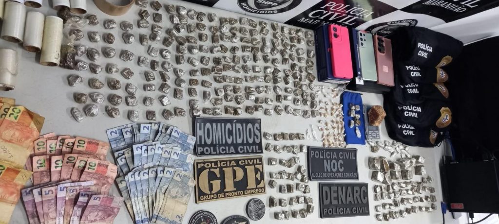 Na residência dos criminosos foi apreendida uma grande quantidade de maconha, crack, cocaína, além de balança de precisão, material para embalar drogas, dinheiro e aparelhos celulares. Os policiais também apreenderam no imóvel cinco camisas da Polícia Civil do Maranhão confeccionadas clandestinamente para fins de serem utilizadas em ações criminosas.