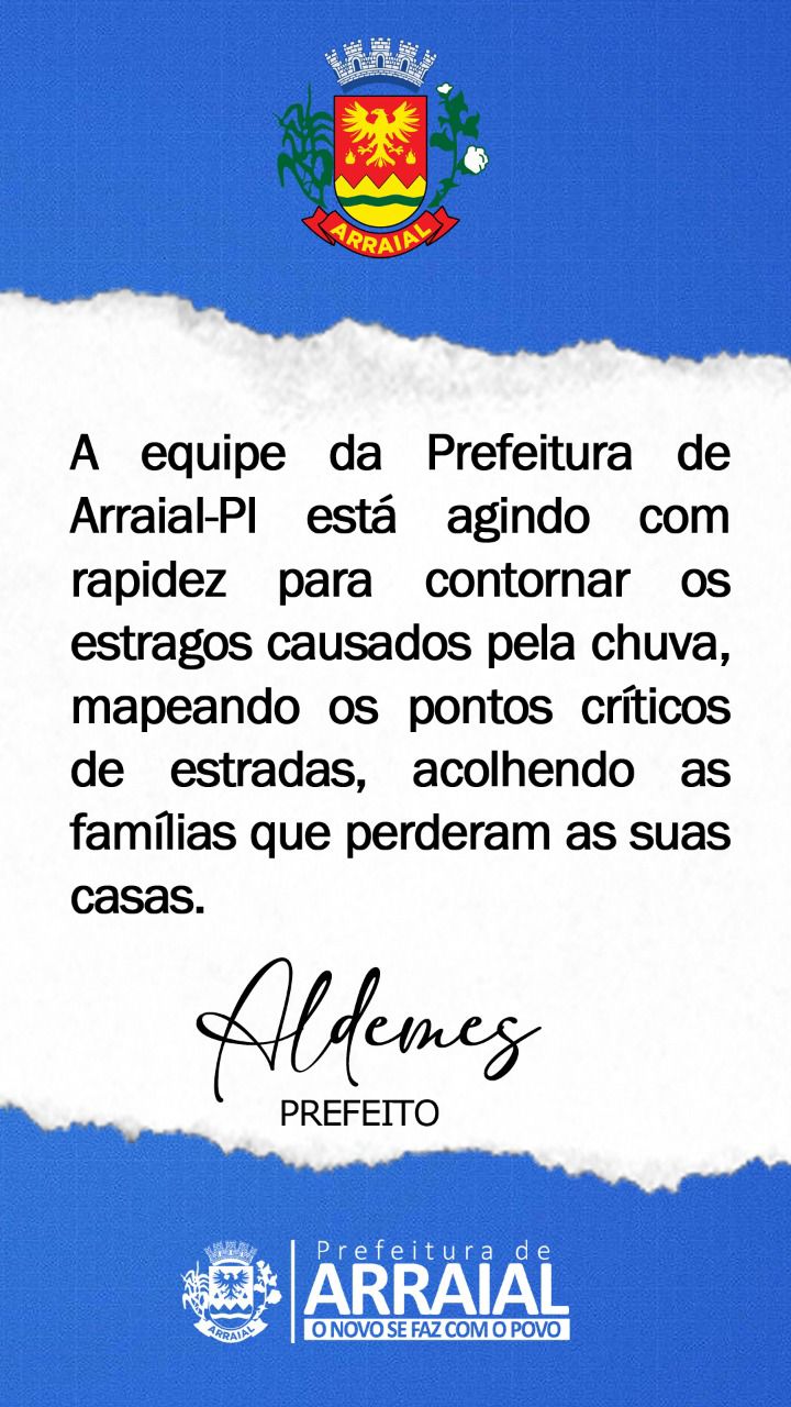 Após tomar conhecimento dos danos causados pela forte chuva que caiu na noite desse sábado na comunidade Chapadinha, o prefeito de Arraial, Aldemes Barroso (Progressistas), emitiu uma nota e um áudio ao Somos Notícia se prontificando a ajudar as famílias que foram diretamente afetadas com o temporal.