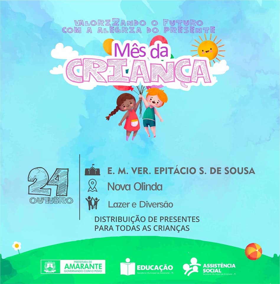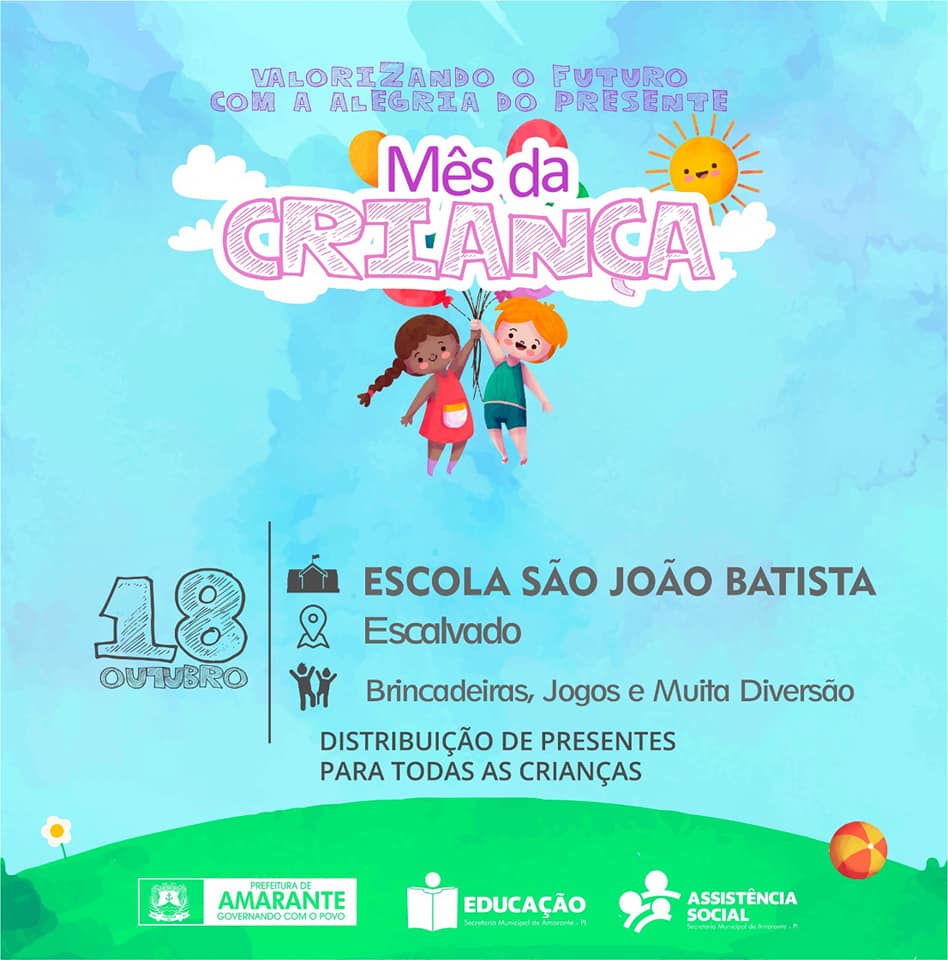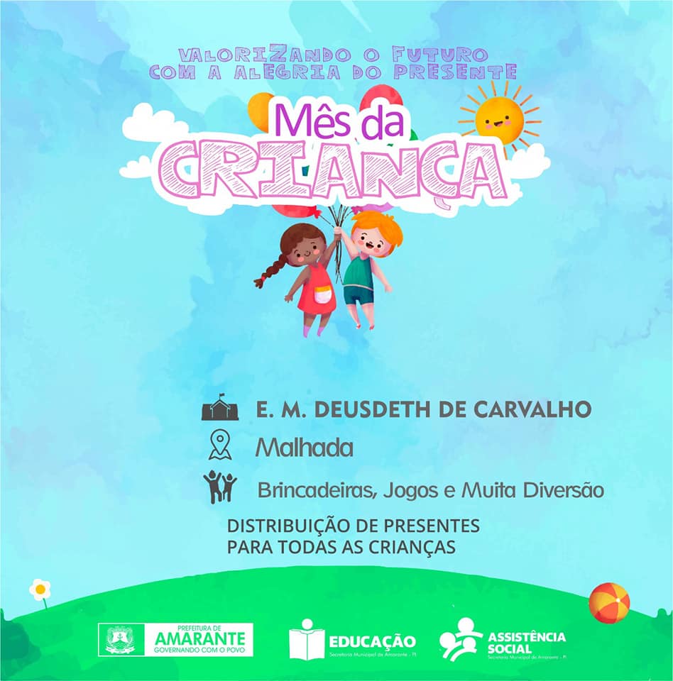 A Prefeitura de Amarante, através da Secretaria Municipal de Educação, vai levar diversão e entretenimento neste mês de outubro às crianças e adolescentes por meio do projeto ‘Mês da Criança nas Escolas Municipais’. A iniciativa é alusiva à passagem do Dia da Criança, que se comemora no próximo dia 12, sábado.