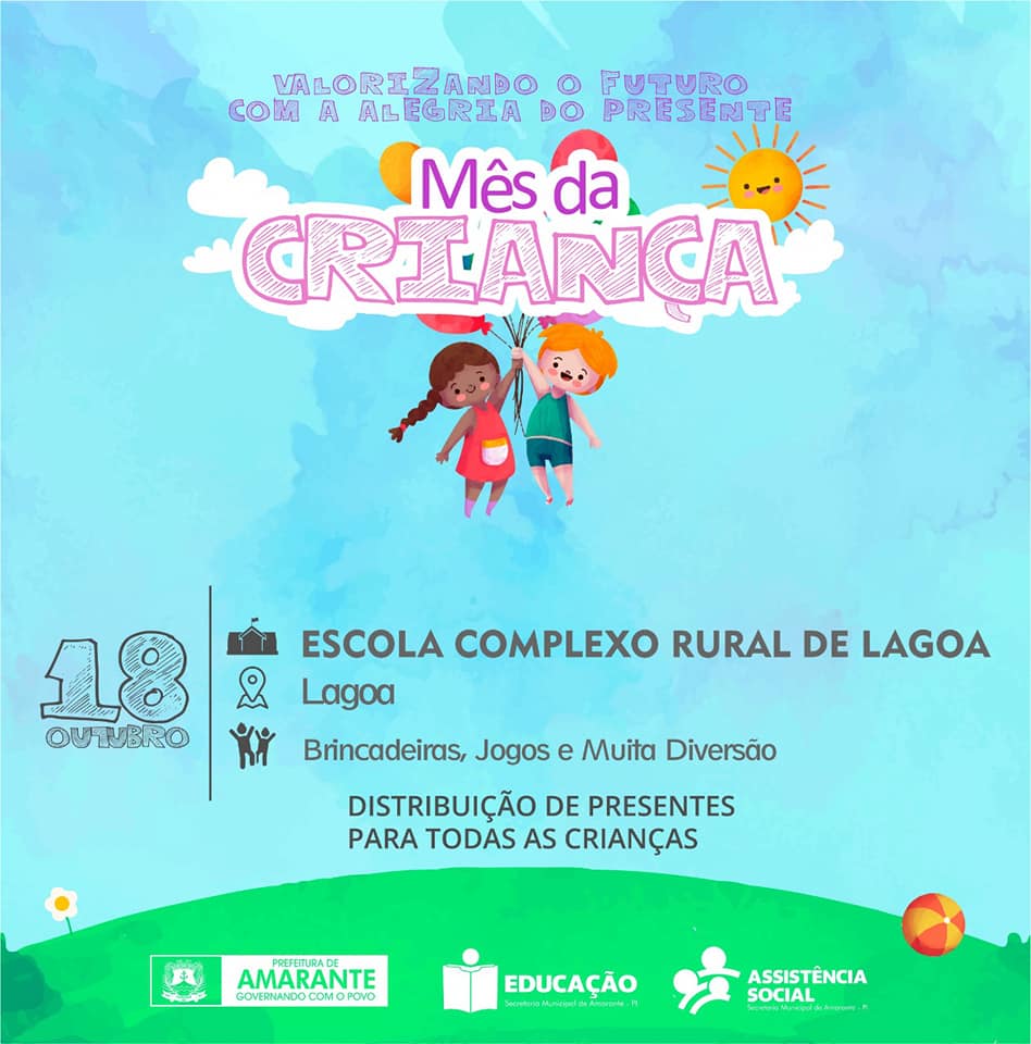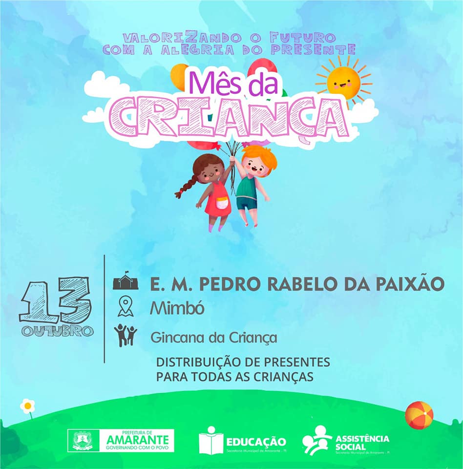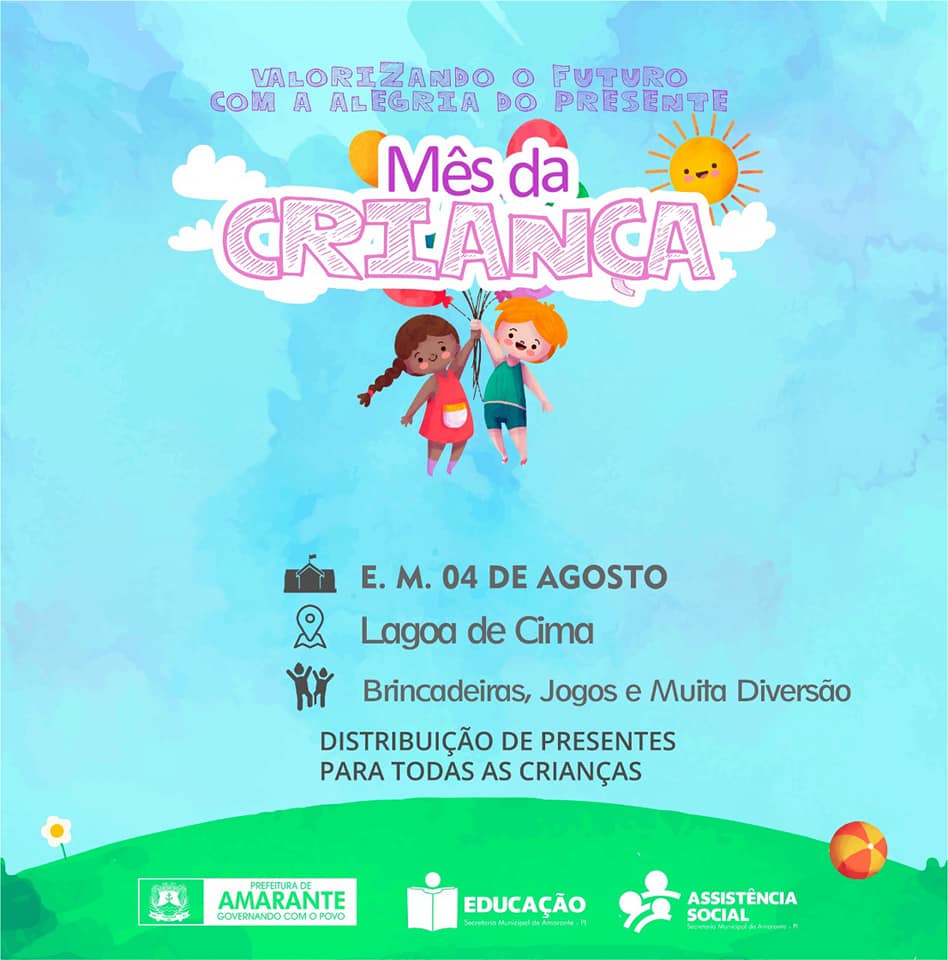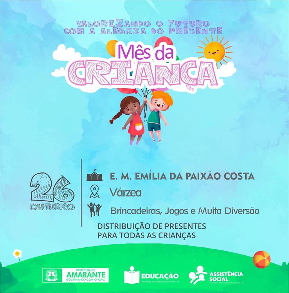 A Prefeitura de Amarante, através da Secretaria Municipal de Educação, vai levar diversão e entretenimento neste mês de outubro às crianças e adolescentes por meio do projeto ‘Mês da Criança nas Escolas Municipais’. A iniciativa é alusiva à passagem do Dia da Criança, que se comemora no próximo dia 12, sábado.