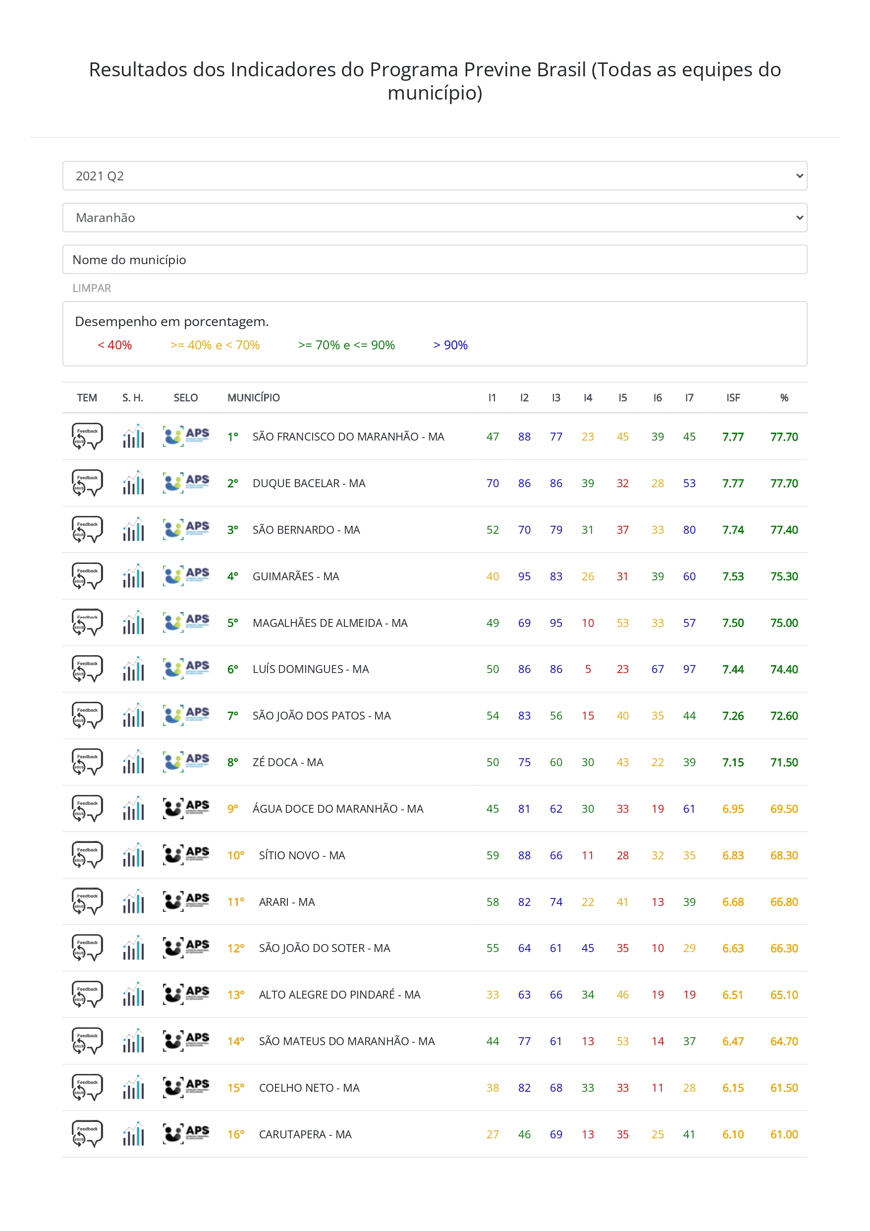 De acordo com o prefeito Adelbarto Santos, esta é a primeira vez que o município chega a esse nível em qualidade de saúde aplicada. Segundo os números, São Francisco do Maranhão alcançou 77,77% de desempenho em porcentagem.