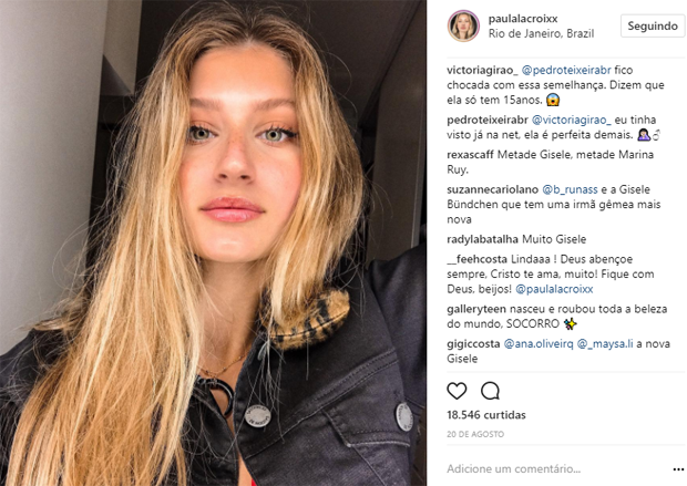 No Instagram, ela está com 108 mil seguidores, número que não para de subir. Alguns dos vários comentários dizem que “Gisele Bündchen tem uma irmã gêmea mais nova”; “a nova Gisele”,”@gisele é plágio, olha tá te copiando, é muito igual” e outro comentário diz “outra Gisele linda”.