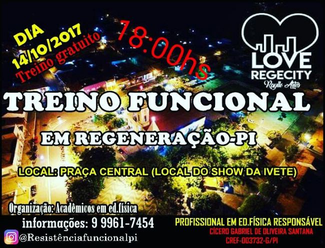 A partir das 18h do dia 14, sábado, os acadêmicos de Educação Física vão levar à praça Central, em Regeneração, o primeiro Treino Funcional Gratuito.