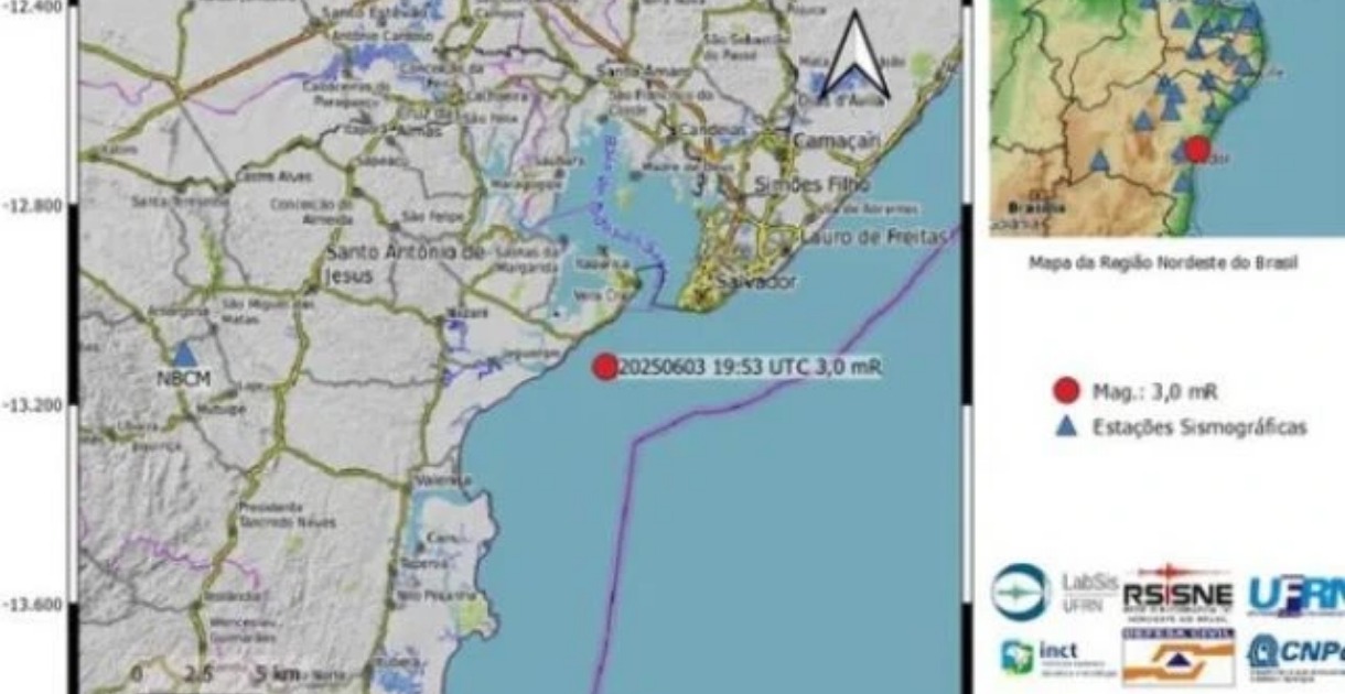 Um tremor de terra de magnitude 3.0 na escala Richter foi registrado na tarde de terça-feira (03), na plataforma continental brasileira, próximo à região do Recôncavo Baiano.