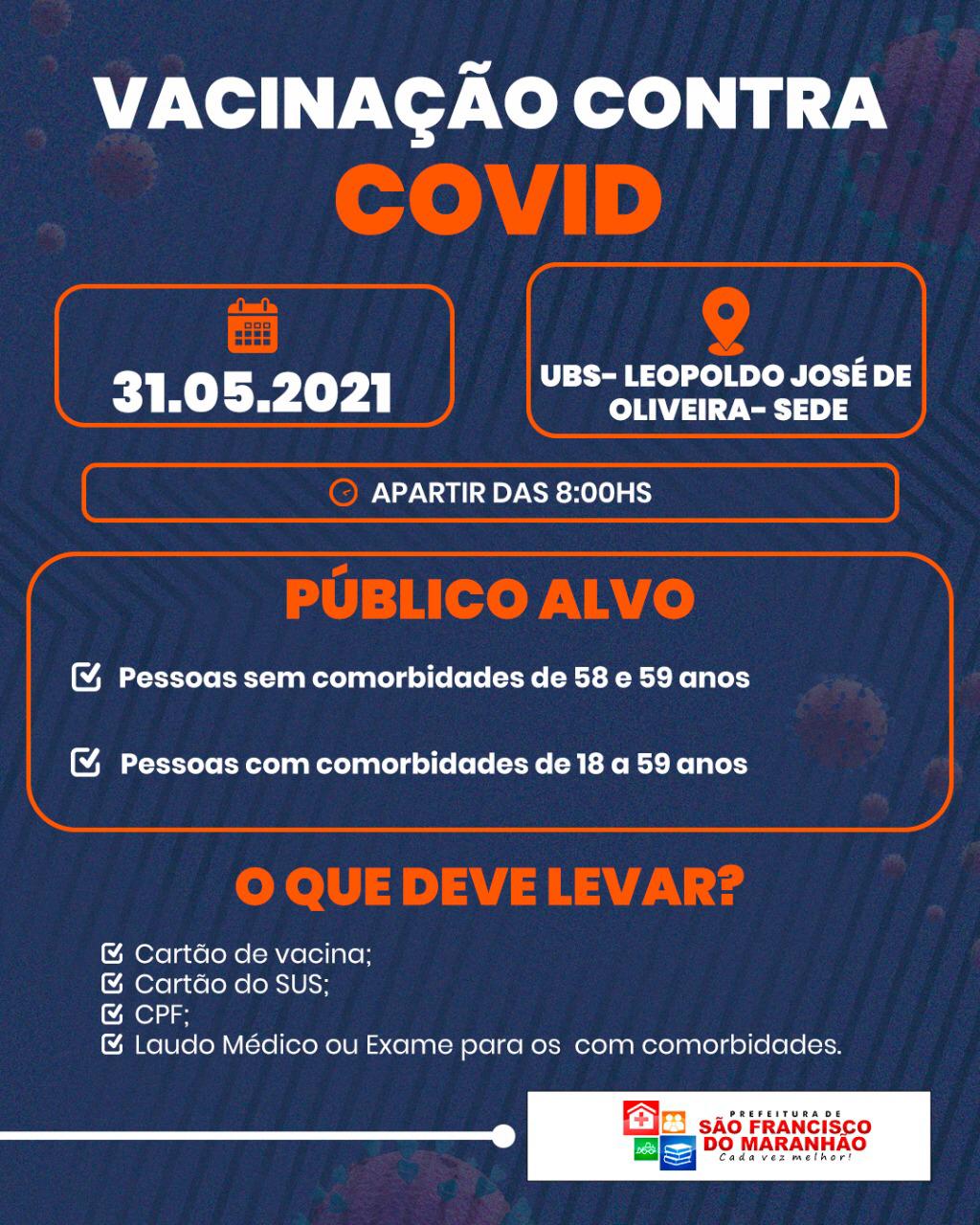 Franciscoenses com 58 e 59 anos começarão a ser vacinados contra a Covid-19, a partir desta segunda-feira (31). A informação é da Prefeitura de São Francisco do Maranhão, por meio da Secretaria Municipal de Saúde.