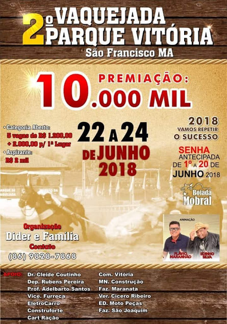 O parque Vitória vai realizar a 2ª vaquejada em São Francisco do Maranhão, de 22 a 24 de junho. De acordo com a organização, o evento vai ser a repetição do sucesso de 2017, que foi um das maiores vaquejada já realizadas na região.