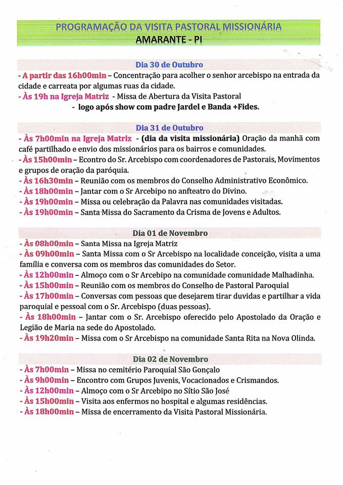 Programação da I Visita Pastoral Missionária em Amarante; 30 de outubro a 02 de novembro